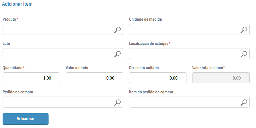 Para facilitar no preenchimento da nota, ainda estão disponíveis os campos Pedido de compra e Item do pedido de compra. Ao terminar todos os dados do produto, clique no botão Adicionar. Depois, se houverem mais itens nesta nota fiscal, apenas vá repetindo o processo.