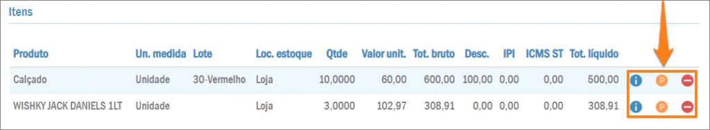 Além da compilação dos dados dos produtos, esta lista tem três botões que ficam ao lado de cada item. O sinal de menos exclui o produto da nota fiscal. A letra P permite informar o Pedido de compra o Item do pedido de compra: