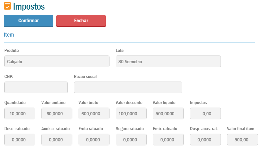 E a letra I abre a tela de impostos. Você pode visualizar todas as informações, ou até alterar os dados. Se quiser manter as alterações, basta clicar no botão Confirmar.