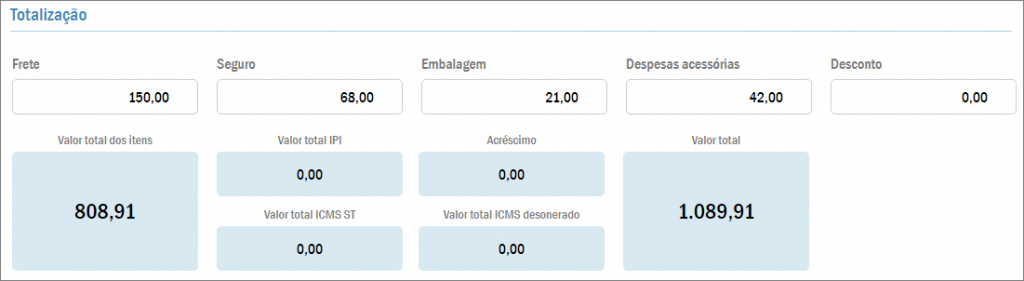 Logo abaixo aparece a guia Totalização. Nela serão exibidos o valor total de alguns impostos, o Valor total dos itens e também o próprio Valor total da nota. Além disso, aqui você pode adicionar valores relativos a Frete, Seguro, Embalagem, Despesas Acessórias e Desconto: