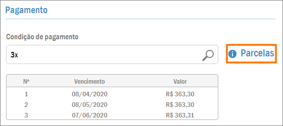 Por fim, vemos a guia Pagamento. Nela você deve selecionar a Condição de pagamento. O sistema automaticamente calculará os títulos: