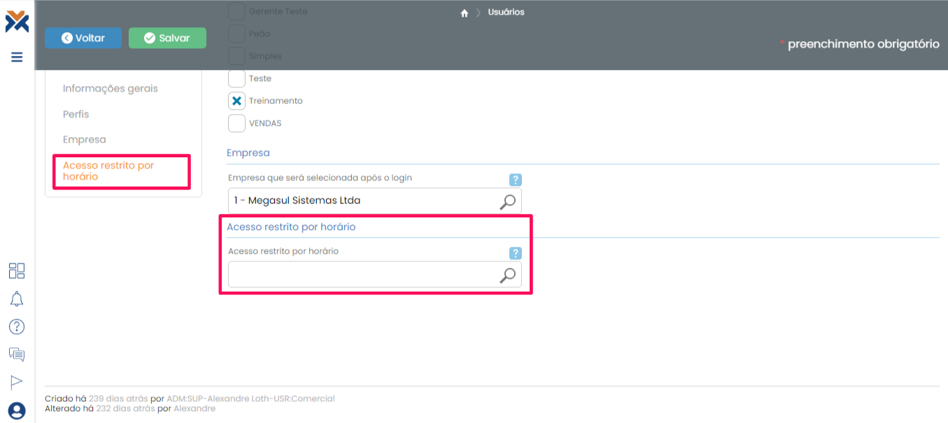 Após isso, desça a barra de rolagem da tela até a divisão “Acesso restrito por horário” e, ao clicar no símbolo do campo, selecione o quadro de horário que o usuário deve se restringir.