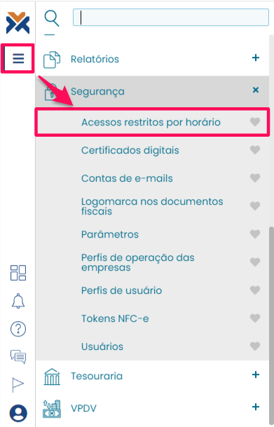 Acesse o sistema do VarejoCloud e clique nas três barras laterais para abrir o menu. Vá até a guia Segurança > Acessos restritos por horário.