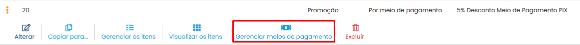 Após realizar a criação da lista de preços de tipo Promoção com um subtipo de Por meio de pagamento cadastrado, será vinculado o meio de pagamento em que irá ser aplicado os descontos.