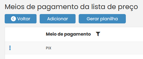 Para isto, basta acessar Cadastros > Produto > Listas de Preço > Produtos e Preço no navegador lateral do VarejoCloud, encontrar a lista de preços previamente cadastrada, clicar em e selecionar Gerenciar meios de pagamento.