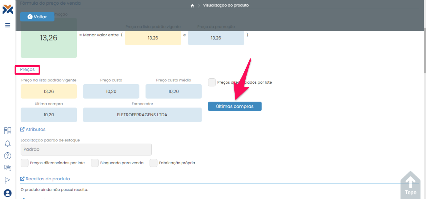 Na página de cadastro de produtos, procure na listagem pelo produto que você deseja visualizar e clique nele. Na página de visualização do produto, desça a barra de rolagem até a seção Preços e clique em Últimas compras.
