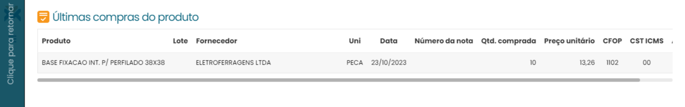 Você entrará na página de registros das últimas compras deste produto, que fornecerá informações como nome do fornecedor, número da nota fiscal, quantidade comprada, preço unitário e situação tributária.