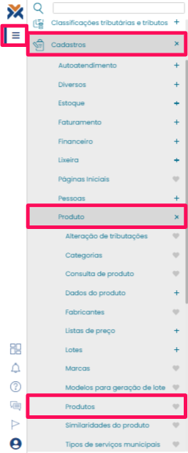 Para verificar essas informações, acesse o VarejoCloud e clique no botão para abrir o menu. Acesse Cadastros > Produto > Produtos.