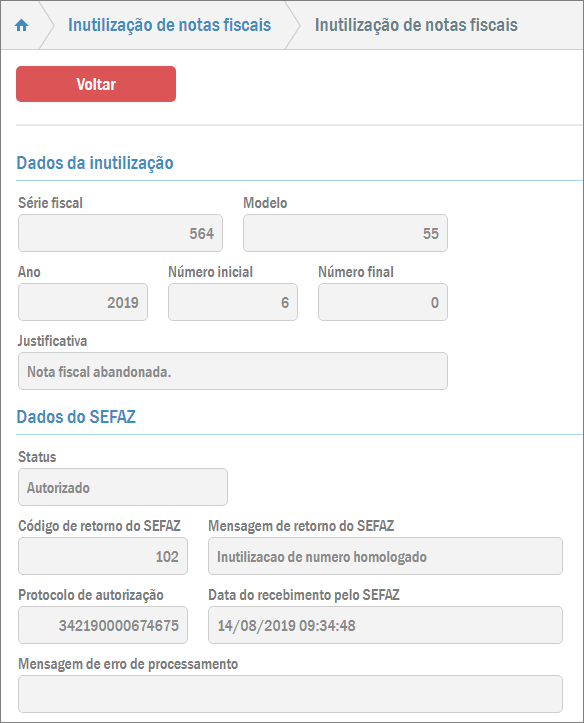 Na tela aberta, o sistema exibirá uma listagem contendo todas as notas que já foram inutilizadas. Para visualizar os dados informados de alguma dessas notas, selecione o registro desejado e clique em Visualizar: