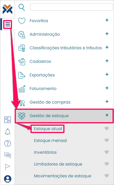 Para acessar esta tela, utilize o seguinte caminho: Menu > Gestão de estoque > Estoque atual.