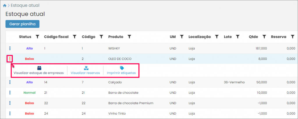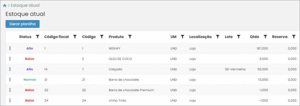 Aqui você poderá checar muitas informações como: a unidade de medida de cada produto, sua localização, de qual lote faz parte, a quantidade remanescente em estoque no momento da consulta, quantos já estão reservados, o preço de venda e o preço de custo do item.