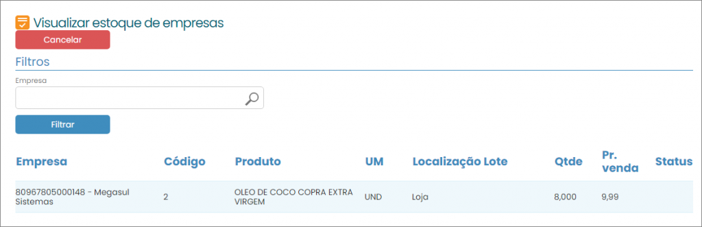 Além disso, no campo Empresa você pode selecionar apenas uma empresa e deixar a listagem ainda mais específica, exibindo um único produto em uma única empresa.