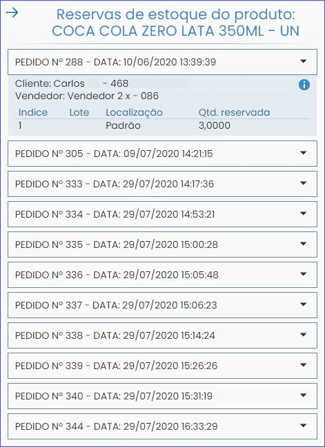 Agora, se na listagem de estoque atual você clicar nos três pontinhos e depois pressionar o botão Visualizar reservas será aberta uma tela destrinchando os pedidos que reservaram o produto em questão. Caso você clicar na seta de algum desses pedidos ainda serão apresentados detalhes sobre ele.