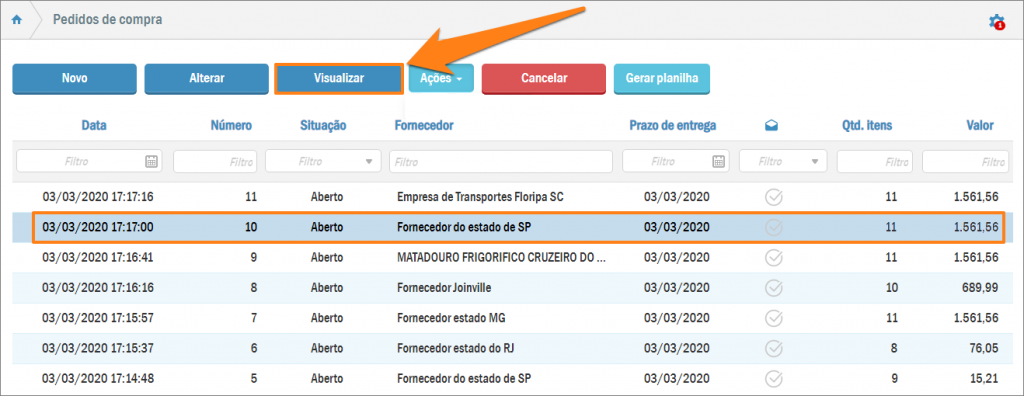 Basta clicar em qualquer um dos pedidos na lista para o sistema habilitar uma série de botões. Você pode pesquisar no campo Fornecedor para encontrar o pedido desejado. O sistema buscará pela razão social da empresa e também pelo nome fantasia, se você preferir.